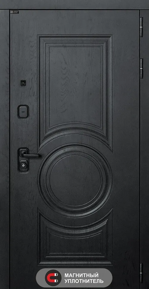 Фурнитура в черном цвете: Броненакладка врезная, накладка со шторкой, глазок , дверная ручка, ночная задвижка. Цилиндр ключ-вертушка Apecs, регулируемый эксцентрик.